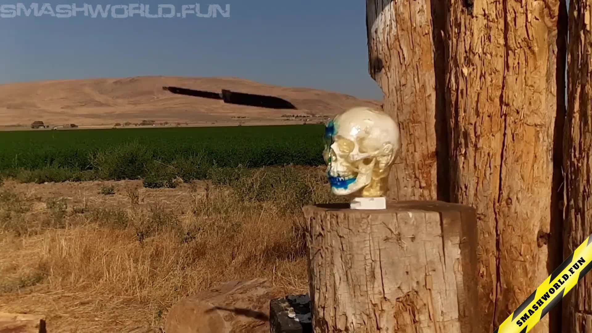 A medieval mace replica strikes a realistic ballistic gel head with embedded synthetic bones, captured in high-speed slow motion. Upon impact, one of the metal spikes pierces the skull, releasing vivid blue liquid that imitates blood. Each frame reveals the intricate details of the strike — from the initial contact and shockwave through the gel to the slow expansion of fractures and fluid dispersal. The footage provides a mesmerizing look at force transfer, material resistance, and the physical dynamics of a bludgeoning weapon in motion.