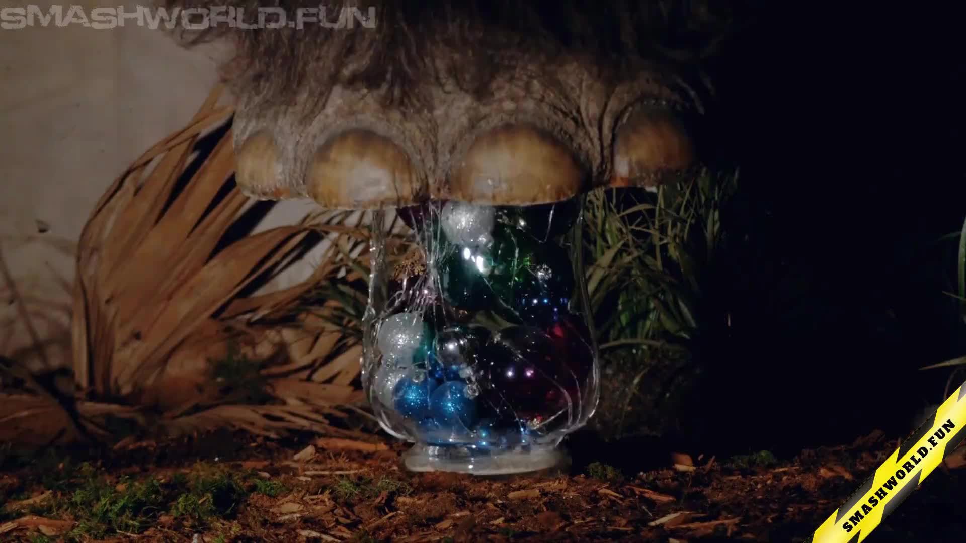 An artificial mammoth leg presses down onto a sculpted ice figure, captured in crisp high speed slow motion. The frozen form fractures instantly, splitting into countless sparkling shards that scatter outward in a cold, crystalline burst. Slow motion reveals sharp edges, drifting ice dust, and the elegant geometry of breaking ice, turning a single impact into a visually striking and atmospheric moment.