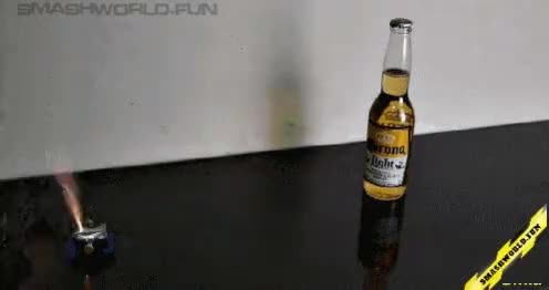 A person strikes the neck of a glass bottle, causing the bottom to shatter and the liquid to pour out dramatically. The scene captures the sudden break and flowing splash in vivid detail, creating a striking and memorable visual moment.
