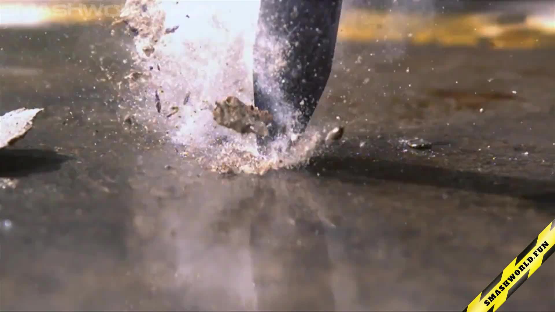 Large section of a building falling down. The heavy concrete and structural elements break apart as they hit the ground, producing dust and debris. The sequence captures the dramatic collapse and destruction of the building fragment.