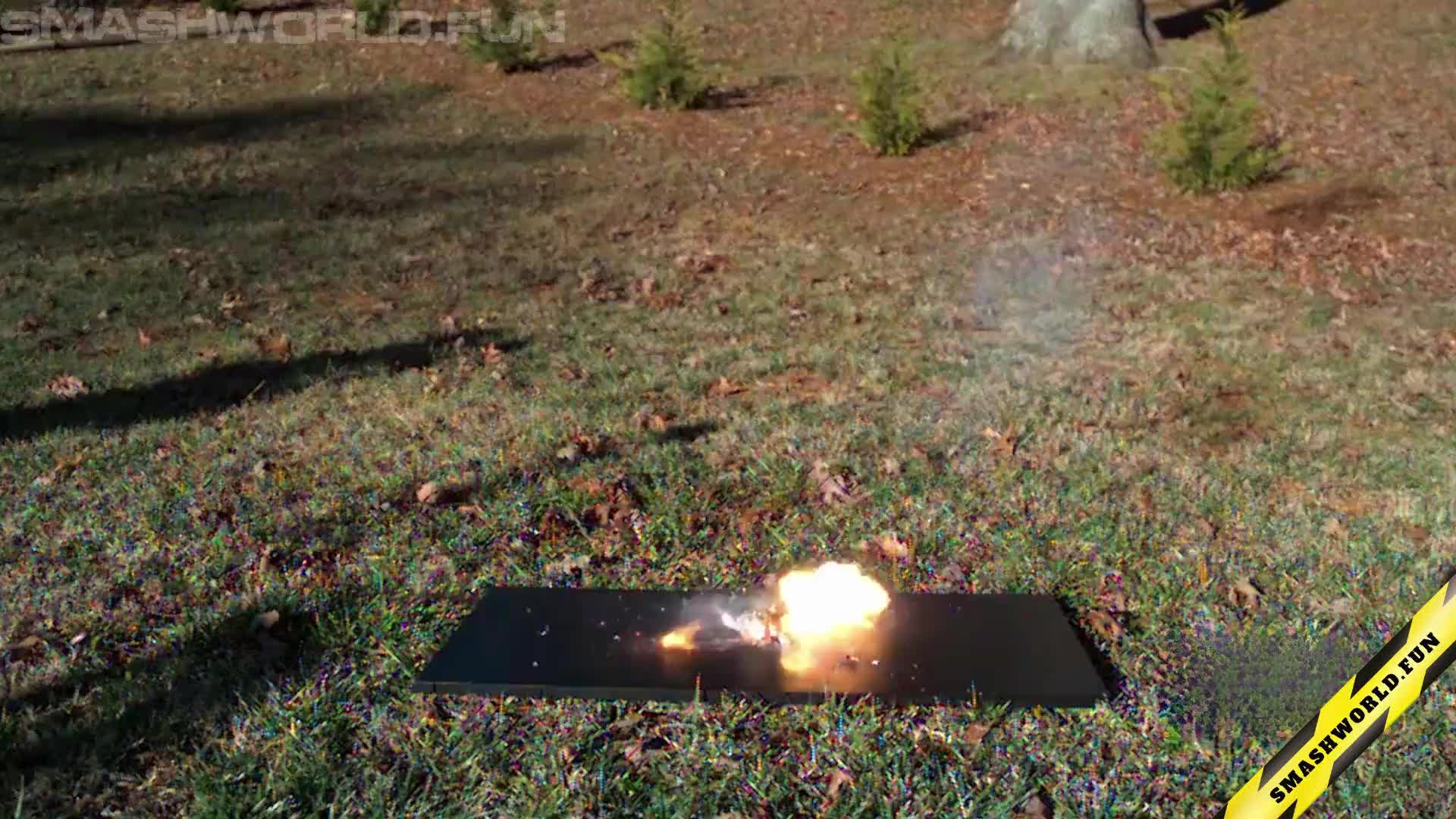 A high-speed camera captures a controlled car explosion in an open space, showcasing the dramatic eruption of metal, glass, and debris in vivid detail. The footage highlights the powerful blast and the intricate patterns formed as the car disintegrates.