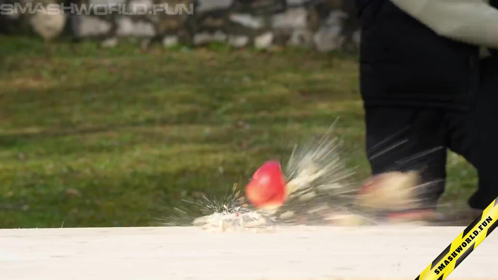 A sharp snap of a whip’s tip strikes a ripe pineapple, and the fruit dramatically splits into two pieces. The footage highlights the vivid texture of the pineapple’s patterned skin and the bright, juicy interior revealed at the moment of impact. Each frame captures the expressive burst of fibers and droplets, creating a dynamic and visually rich scene that emphasizes the precision and force of the strike.