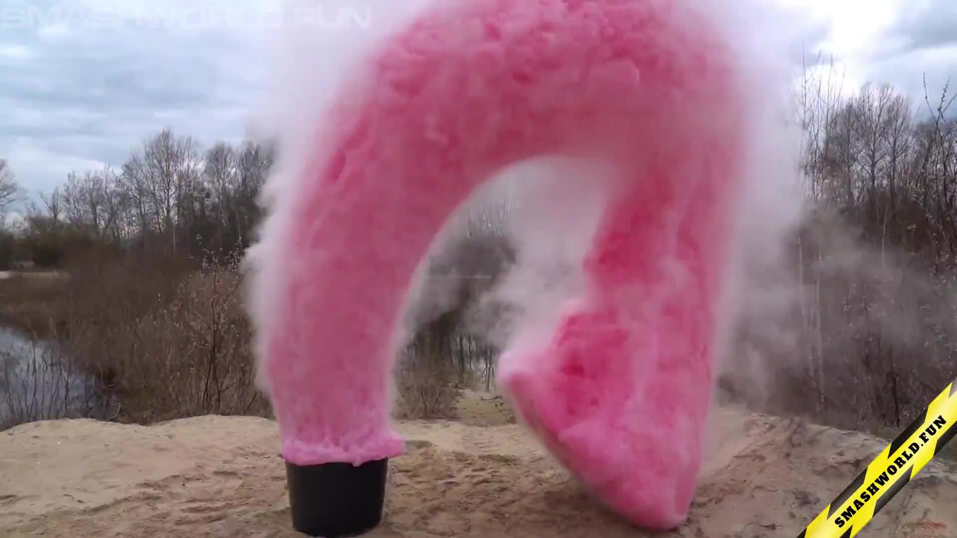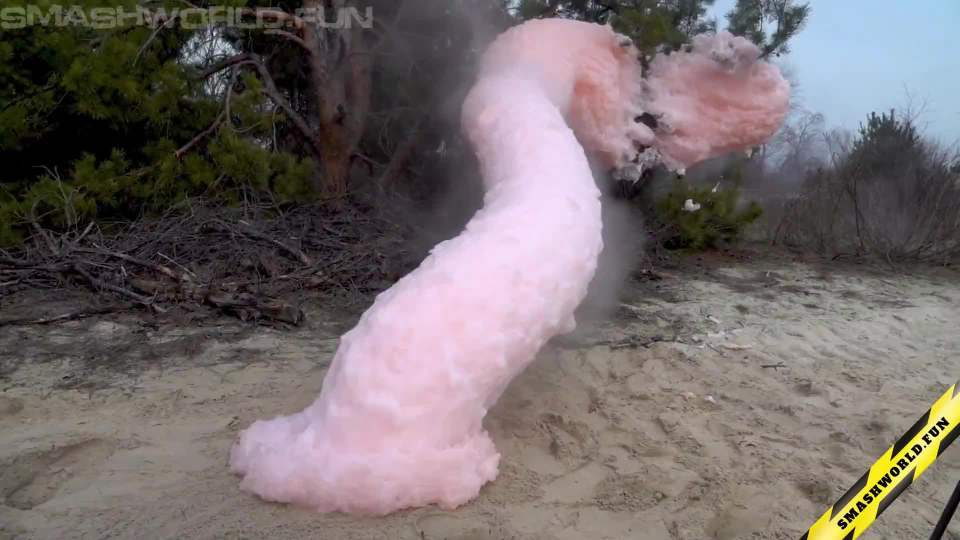 A mesmerizing demonstration of the classic elephant toothpaste experiment, where a person skillfully mixes chemical reagents in a tall glass tube, causing a towering eruption of foamy paste that bursts dramatically upwards. The scene captures the vibrant reaction and dynamic flow in a visually stunning way.