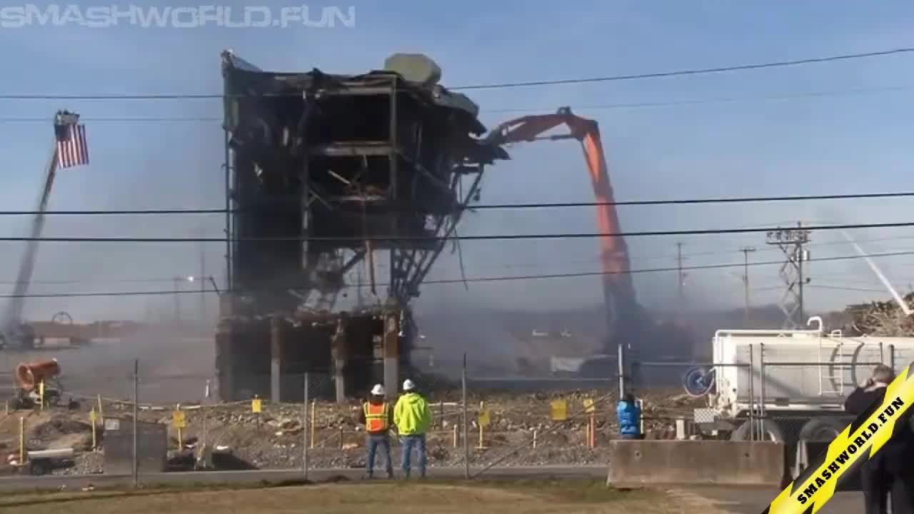 A small chapel is brought down as an excavator carefully demolishes its structure. Captured in clear detail, this footage showcases the powerful machinery in action and the gradual collapse of the charming building.