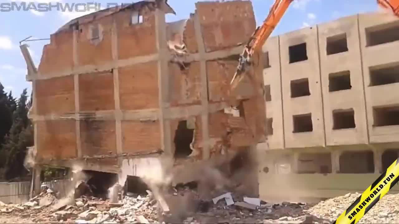 An excavator strikes a house during demolition, causing the structure to tilt dramatically before collapsing to the ground. The powerful machine delivers a decisive blow, and the building gives way in a cloud of dust and debris. This striking moment captures the raw force of heavy machinery and the dramatic fall of an old structure in a vivid and captivating way.