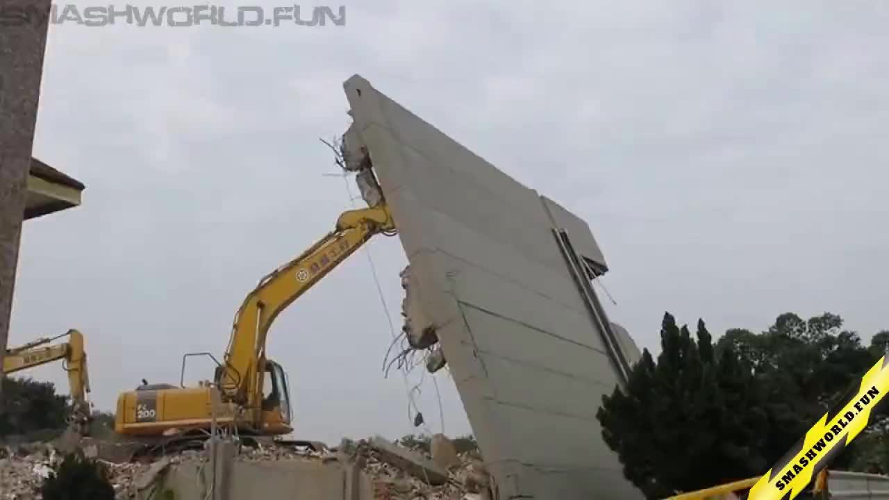 A powerful excavator is captured tearing down a brick structure, gradually dismantling walls until the entire building collapses. The scene showcases the strength of heavy machinery and the dramatic fall of bricks, offering a mesmerizing view of controlled destruction.