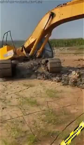 A powerful excavator uses a massive metal rod to break and loosen compacted soil, demonstrating the raw force of heavy machinery at work. The ground cracks and shifts as the steel pierces through the earth, creating a striking scene of mechanical strength and precision.