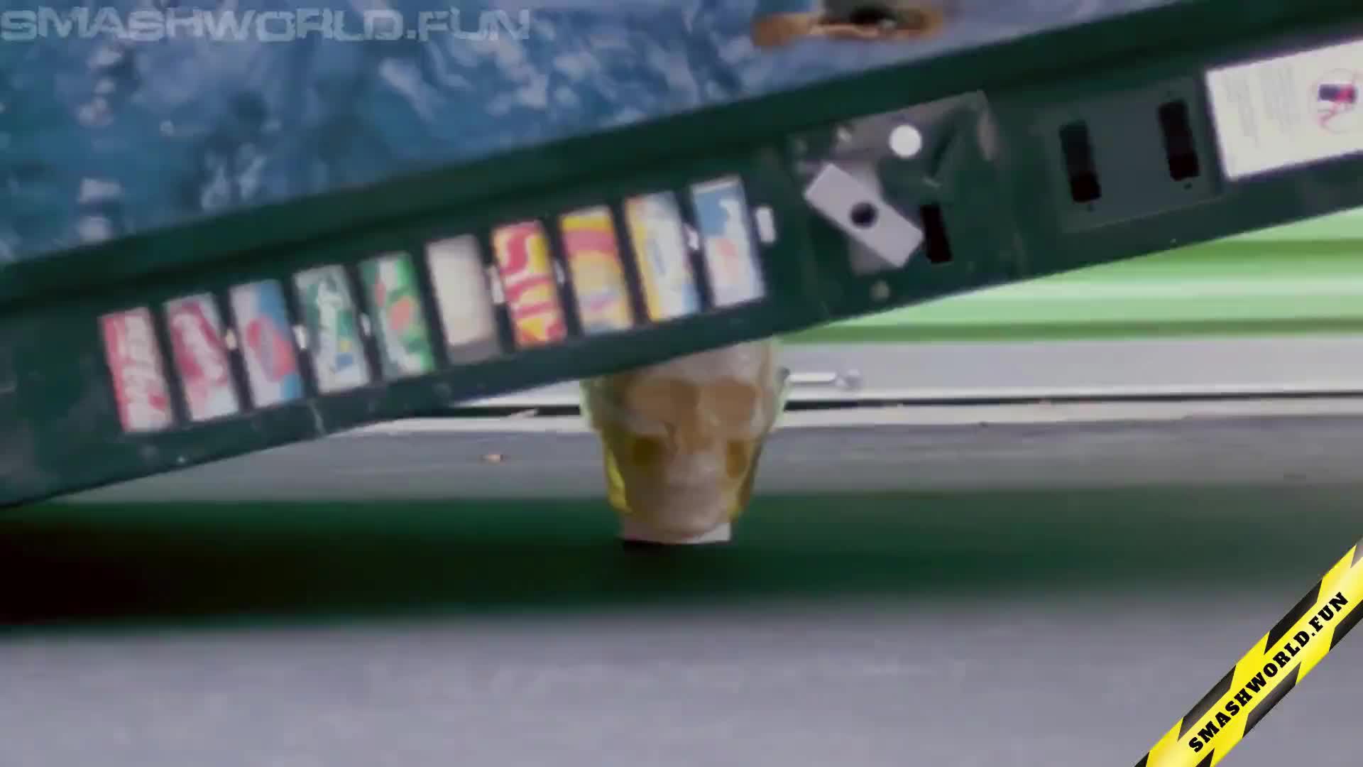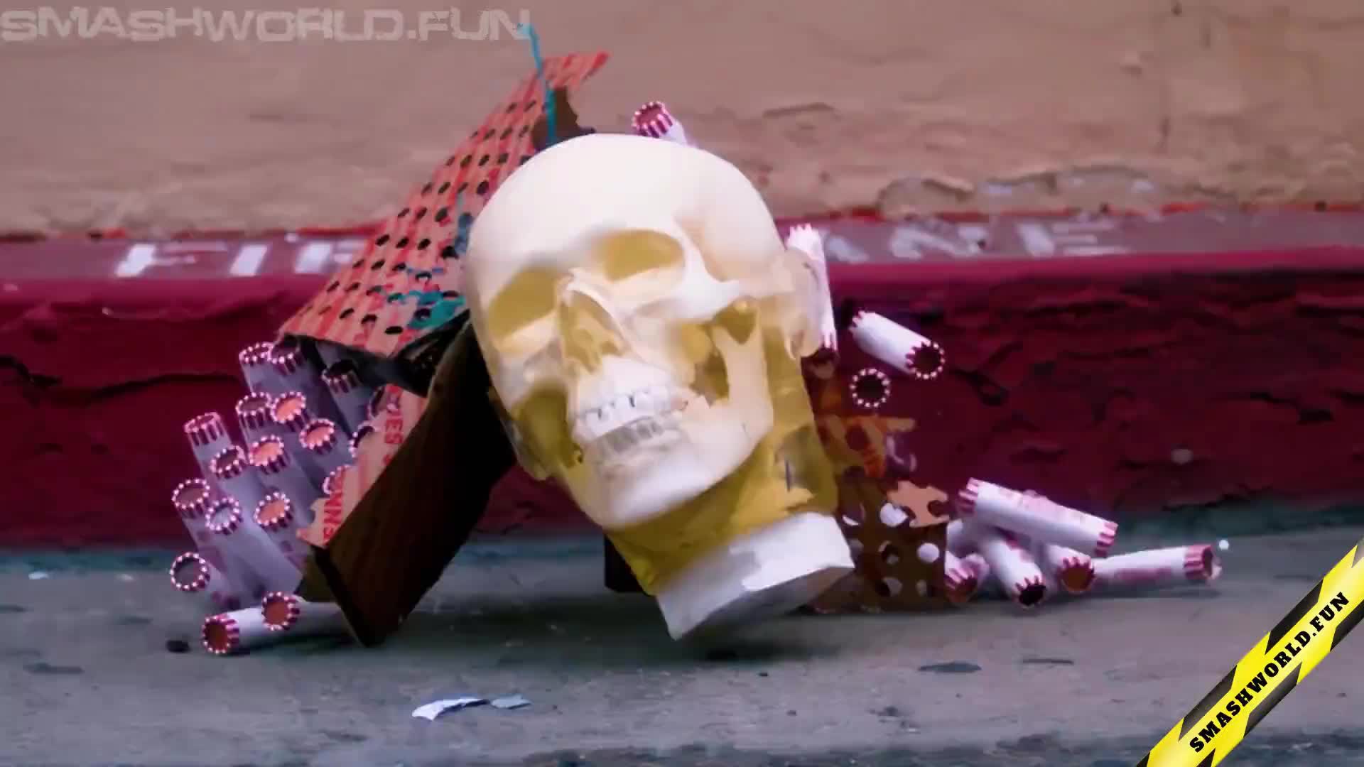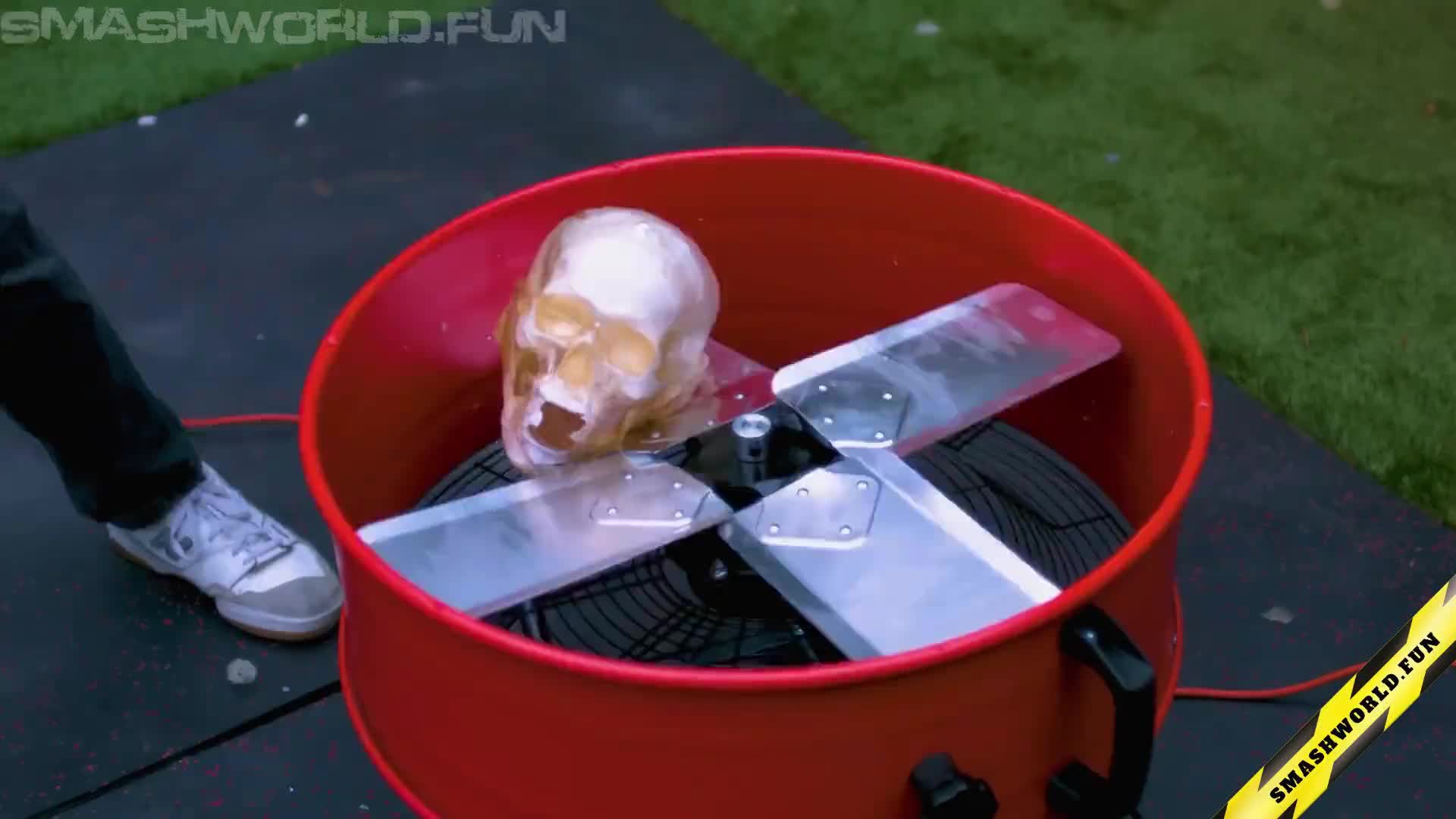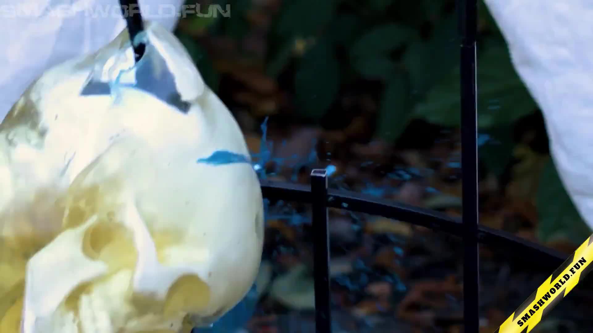 A large tree crashes down onto a realistic ballistic gel head embedded with synthetic bones, all captured in detailed high-speed slow motion. The massive impact flattens the gel structure, creating a mesmerizing display of compression, fracture, and material deformation. As the weight of the trunk makes contact, the surface ripples and internal structures collapse under pressure, revealing the raw mechanics of impact and force distribution in a visually striking sequence. The slow motion footage highlights every intricate detail of this powerful natural collision.