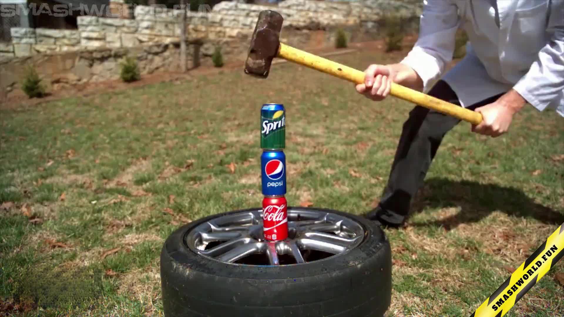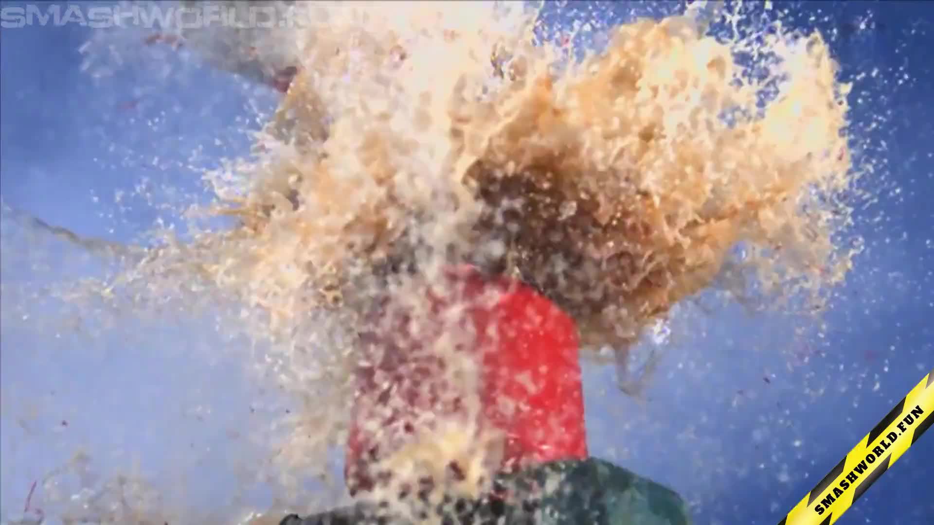 A high speed camera records the moment an aluminum Fanta can is placed beside a running lawnmower engine, capturing how the rotating wires slice into the metal and release a vivid burst of orange soda. The slow motion view reveals swirling sprays, shimmering droplets, and the dynamic deformation of the can as it collapses under rapid impact. This detailed footage provides a colorful and visually striking look at fluid motion, metal tearing, and fast mechanical interaction.