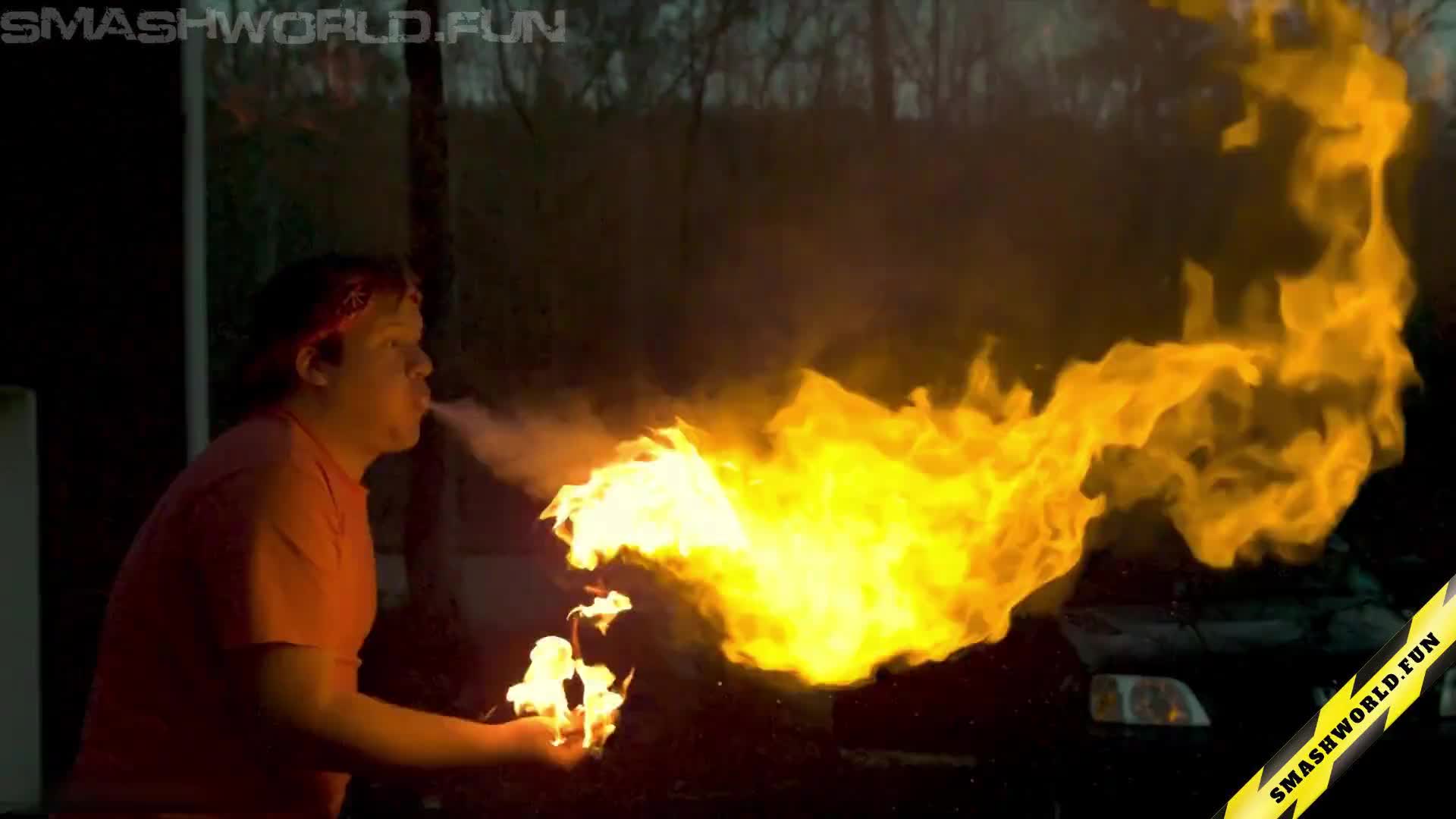 Stunning footage of fire breathing captured from multiple angles with a high-speed camera. The flames erupt with vivid intensity, twisting and swirling in the air, creating a mesmerizing and dramatic spectacle.