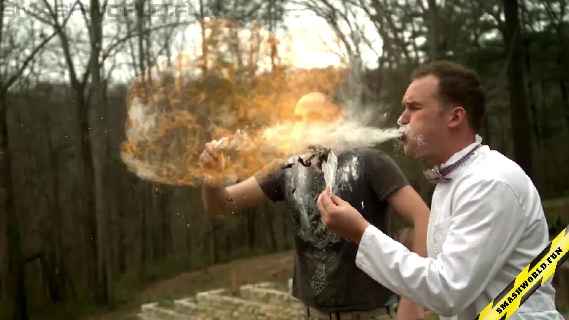 A high speed camera captures a dramatic burst of fire as a performer exhales a bright plume of flame against a backdrop of tall trees. The slow motion footage reveals intricate swirling patterns within the fire, glowing waves of heat, and the shimmering distortion of air as the flame expands outward. Each frame highlights the contrast between the vivid orange flare and the calm natural setting, creating a striking and atmospheric visual composition.