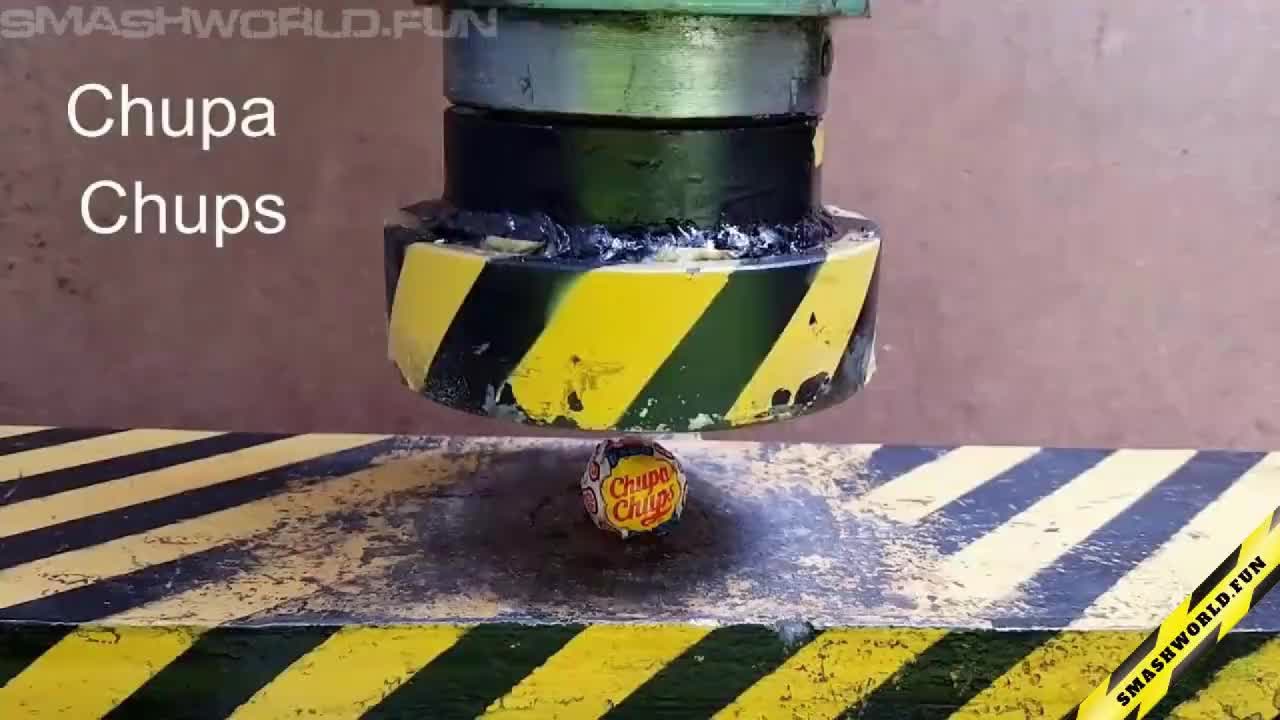 A massive jawbreaker candy faces the unstoppable power of a hydraulic press. As the intense pressure builds, colorful sugar layers fracture one by one, revealing a mesmerizing rainbow pattern within. The candy’s hard shell resists at first, then suddenly bursts into fragments, creating a cascade of vibrant shards and sugary dust. The close-up view captures every intricate detail of the cracking surface and the brilliant transition from glossy perfection to shattered beauty.