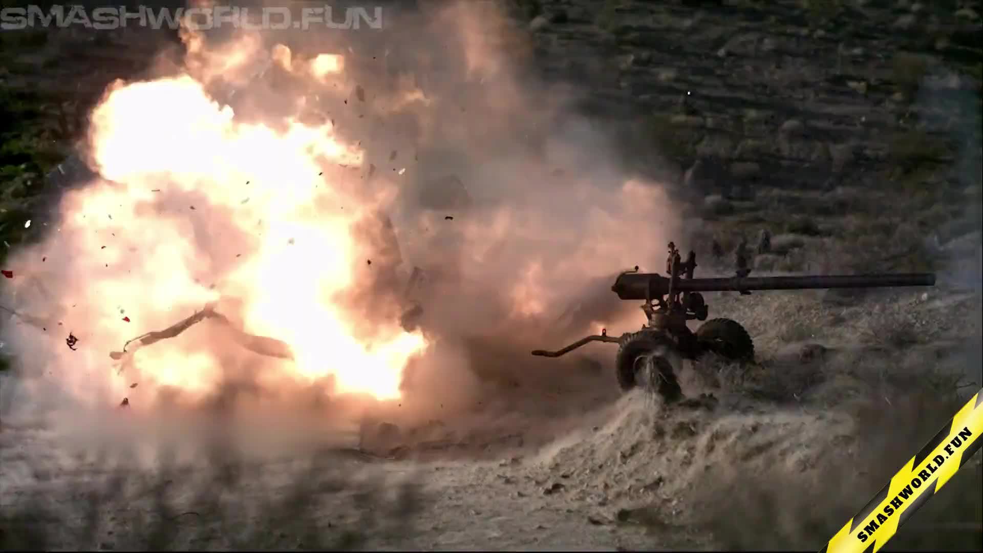 An intense slow-motion capture of a mortar firing, showcasing the powerful recoil and the dramatic blast as the mortar discharges. Every detail of the explosive energy and mechanical reaction is vividly visible, offering a fascinating glimpse into artillery dynamics.