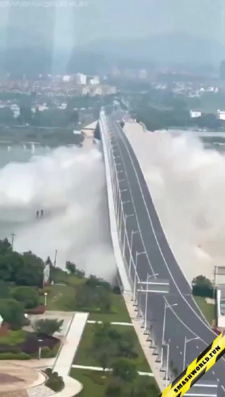 A towering concrete bridge pier is brought down through a coordinated explosive sequence, captured in vivid detail as the massive structure trembles, fractures, and descends in a sweeping collapse. The footage highlights the textured surface of the aging concrete, the dramatic plume of dust rising from the impact, and the striking transition from an imposing vertical column to scattered rubble. The scene offers a clear and expressive look at large-scale structural removal.