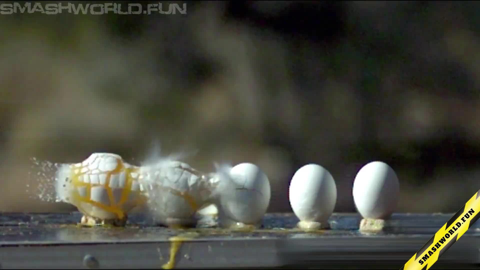A fascinating slow-motion capture of a ping pong ball striking an egg, causing the shell to crack and fragments to scatter. The video highlights the delicate yet dramatic moment of impact with vivid clarity and intricate detail.