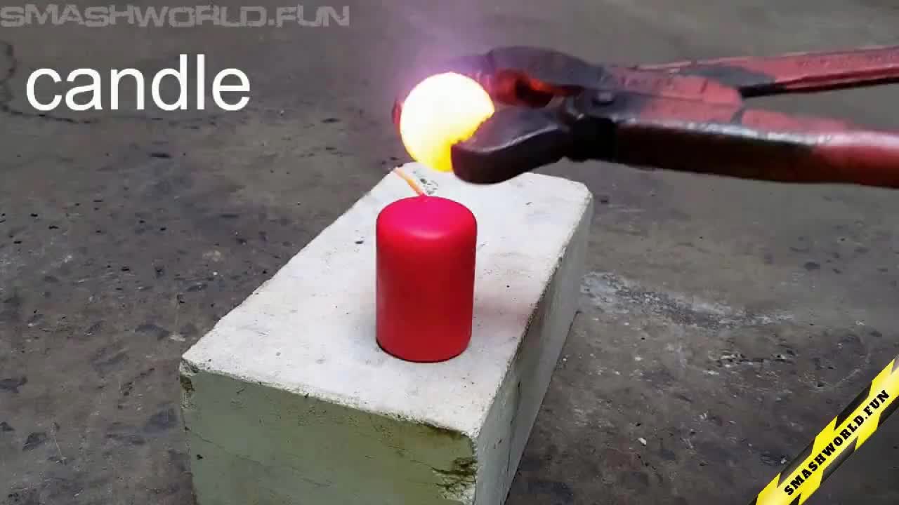 A blazing red hot metal ball is placed onto a thick block of soap, instantly causing it to melt, sizzle, and burst into fiery sprays. The vivid reaction creates a mesmerizing mix of fire, bubbling liquid, and flying droplets, offering a dramatic display of heat meeting an everyday object.