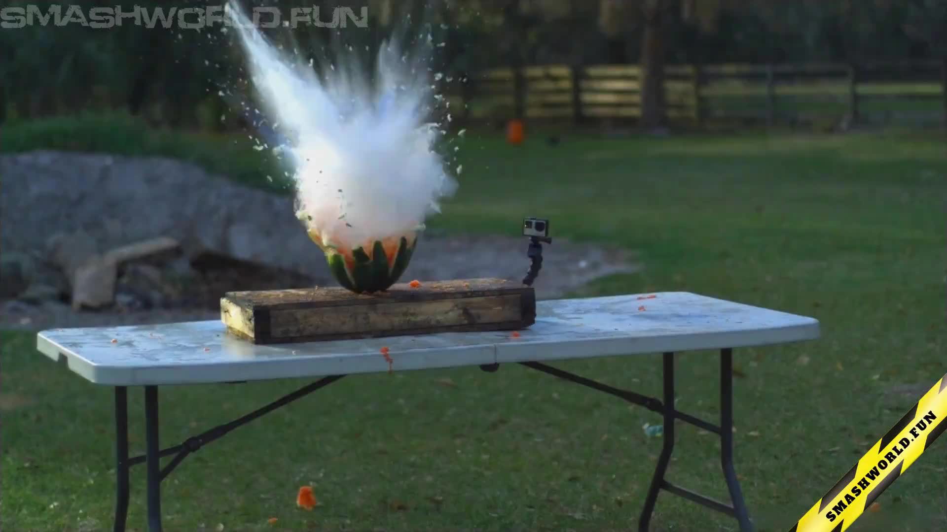 A stunning high-speed capture of a shotgun firing heavy buckshot into a ripe watermelon, showing the moment of impact in breathtaking slow motion. The shot reveals the immense force and pressure as the pellets tear through the fruit, sending fragments and juice flying in all directions. Each frame beautifully illustrates the raw power of the blast and the intricate patterns created by the dispersing shot cloud.
