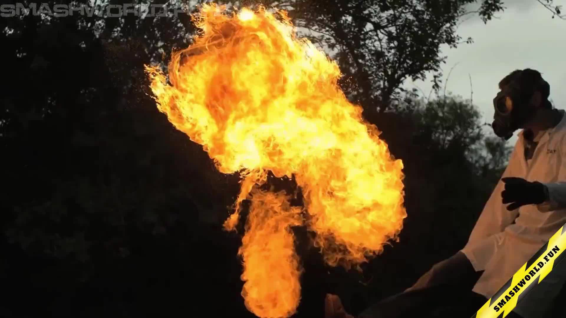 A bucket filled with flammable liquid is ignited, creating a vivid burst of flames before the contents are thrown into the air for high-speed filming. As the liquid leaves the bucket, it forms swirling arcs and droplets that continue to burn mid-flight, producing bright streaks of fire against the background. The high-speed camera captures each flowing contour, revealing intricate shapes, glowing embers, and the dynamic movement of the flame as it stretches and fragments during its brief journey through the air. The result is a dramatic display of fluid motion enhanced by intense, flickering light.