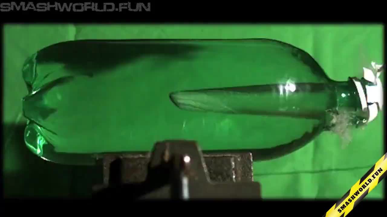 Slow motion shot of an expanding bullet hitting a bottle of water