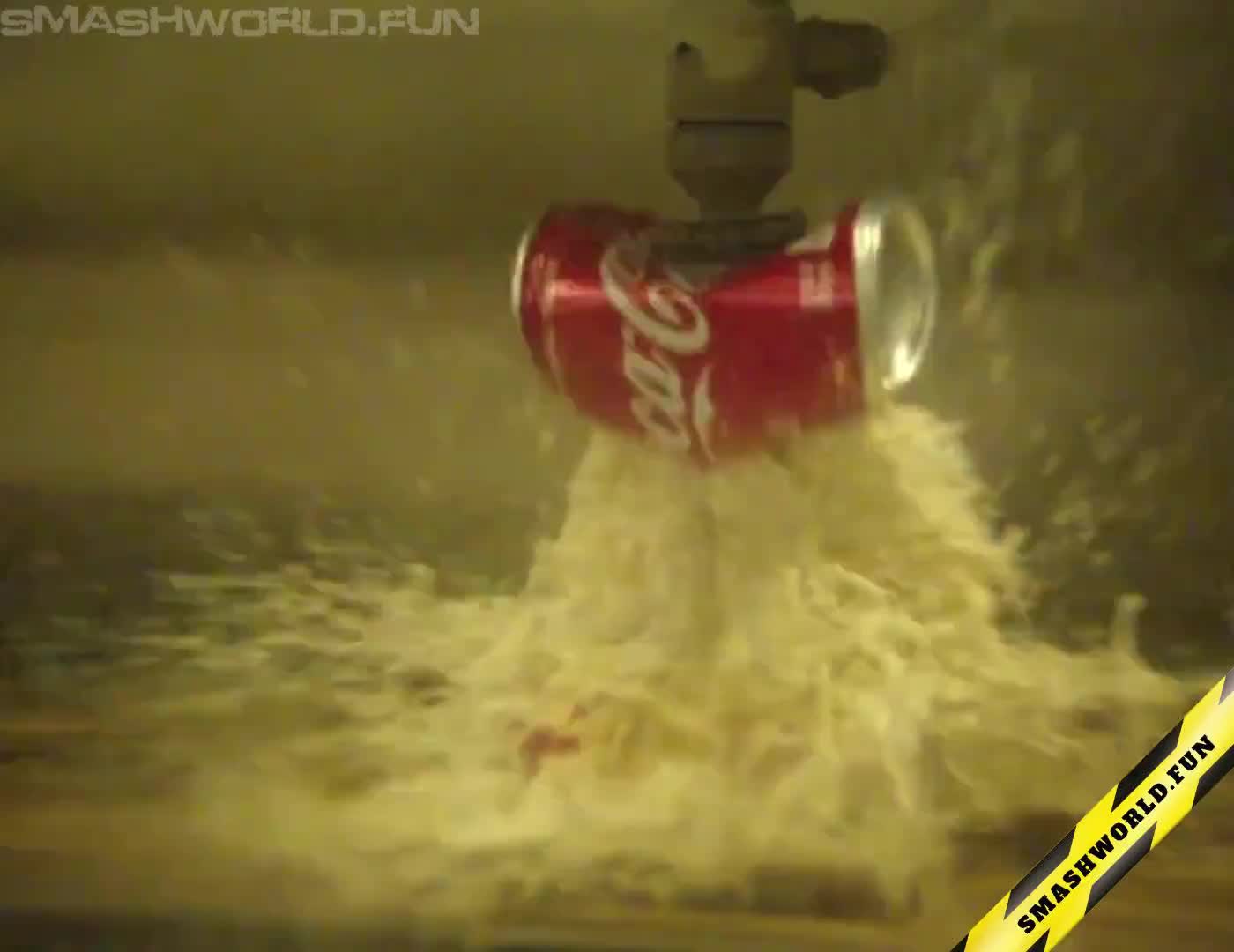 Three stacked soda cans are struck with a massive hammer, causing them to crumple and spray fizzy liquid in all directions. Captured in stunning slow motion, this dramatic footage highlights the explosive release of carbonation and the mesmerizing deformation of metal.