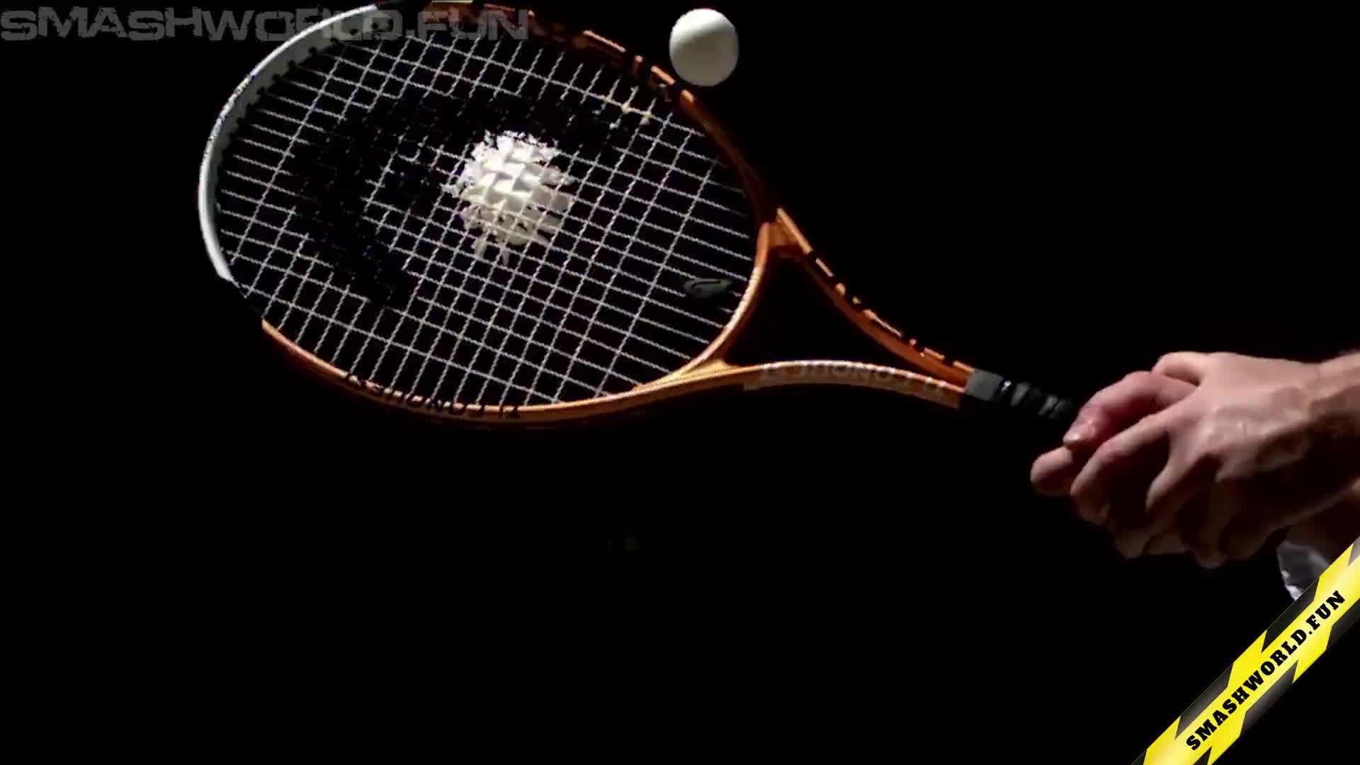 A raw egg is tossed up and hit with a tennis racket, with every stage of the collision recorded on a high speed camera. The slow motion footage highlights the delicate moment the strings make contact, followed by a vivid explosion of yolk and shell fragments that spread in intricate patterns. The detailed frames reveal the elastic deformation of the egg, the graceful flow of its contents, and the dynamic interaction between the moving racket and the fragile shell, creating a visually striking and expressive scene.