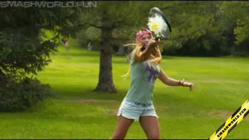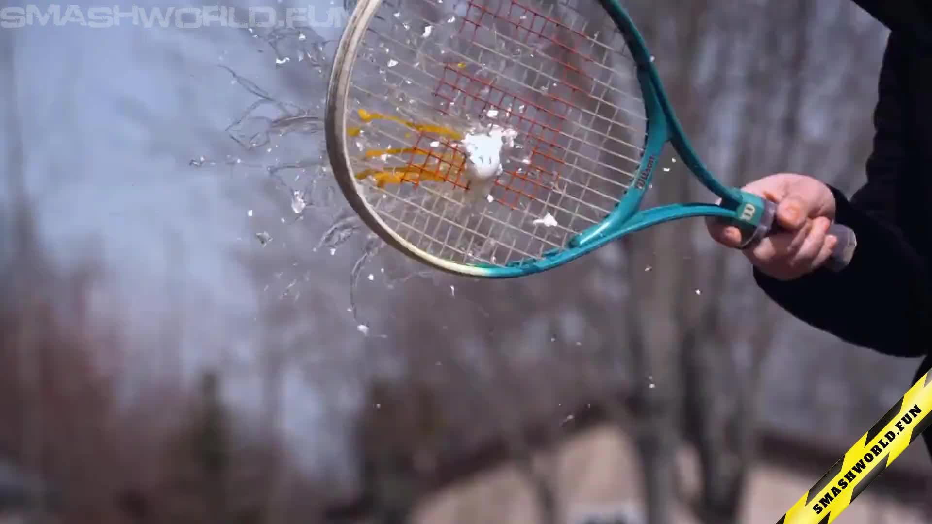 A captivating slow-motion capture of a boiled egg being struck by a tennis racket. The moment reveals the egg's shell cracking and yolk splattering in intricate detail, showcasing the delicate yet dramatic destruction in vivid clarity.