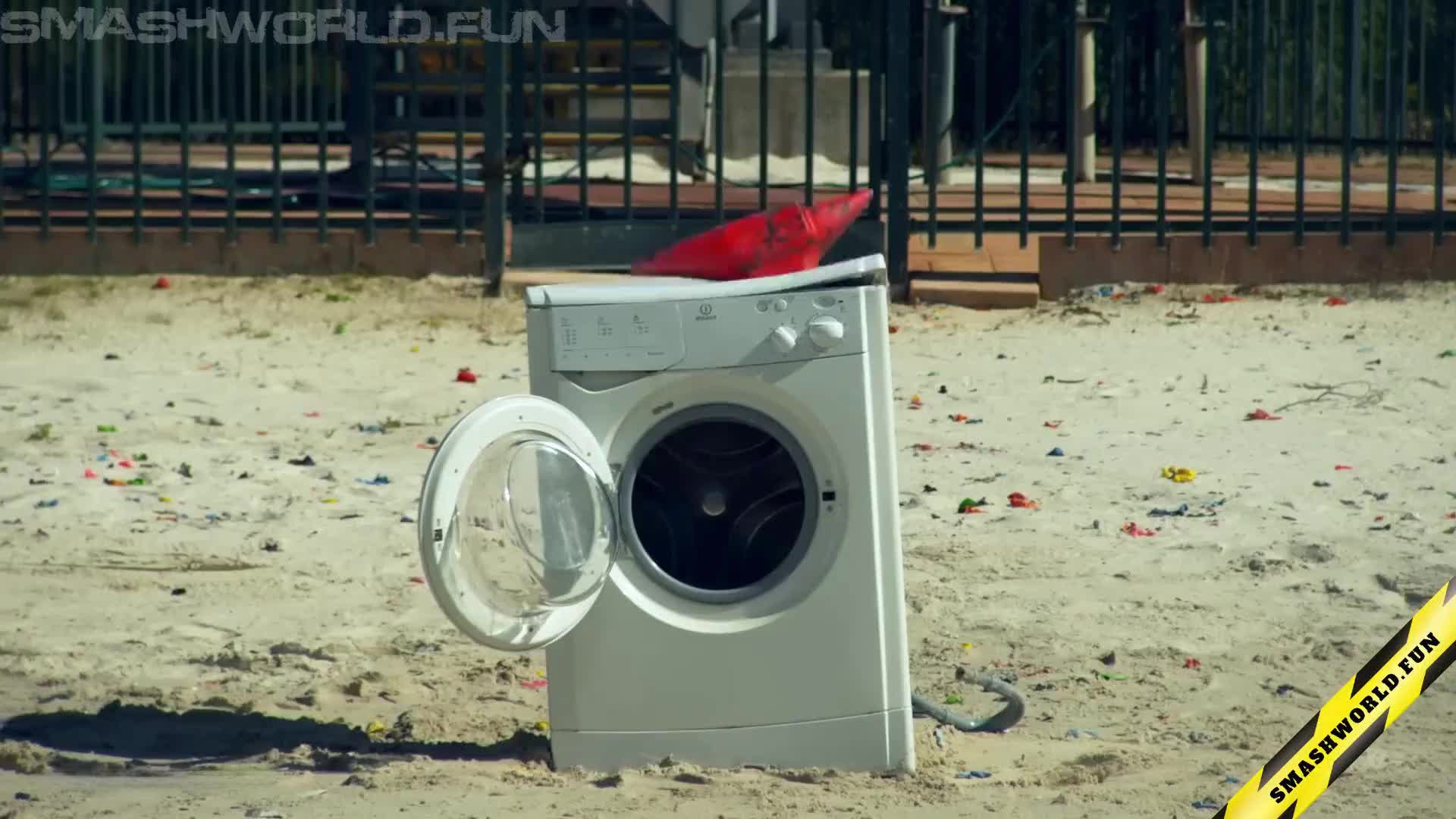 A heavy anvil is dropped from height onto a large television multiple times, with each impact leaving deeper marks and growing fractures across the screen. Filmed with a high speed camera, the sequence reveals the gradual transformation from minor dents to shattered glass and twisted internals. Slow motion captures the dramatic spread of cracks, flying fragments, and the final moment when the television completely breaks apart.