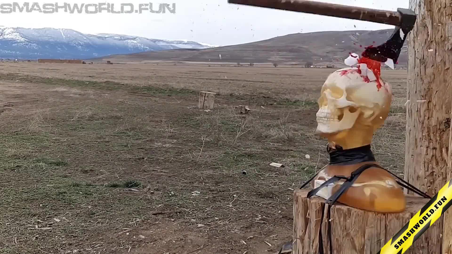 A compact throwing axe is hurled toward a realistic ballistic gel head reinforced with a synthetic bone structure. Captured in mesmerizing slow motion, the axe strikes with incredible precision, piercing through the skull replica and revealing the impact dynamics in vivid detail. Each frame showcases the force, motion, and physics behind a perfectly executed throw, offering a stunning visual exploration of material reaction and kinetic power.