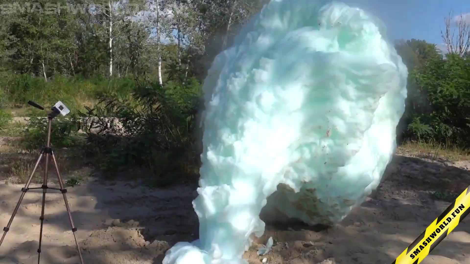 A spectacular chemistry experiment featuring three buried barrels that unleash a vivid display of color and motion. After the reactive ingredients are added, the barrels erupt simultaneously, releasing streams of orange, green, and pink foam. The colorful plumes intertwine and rise into the air, creating a mesmerizing blend of hues and textures. This visually stunning reaction transforms the ground into a living canvas of science and color.