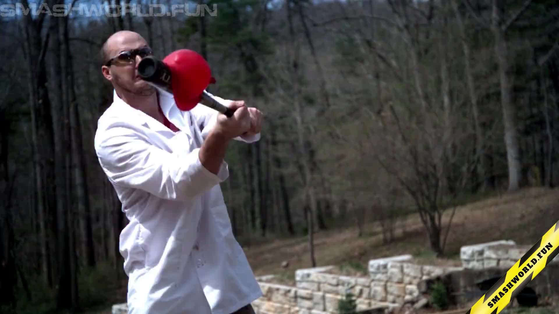 An intriguing capture of a water-filled balloon being struck by a baseball bat. Instead of bursting, the balloon dramatically deforms, showcasing the elasticity and tension of the material in a visually fascinating moment.