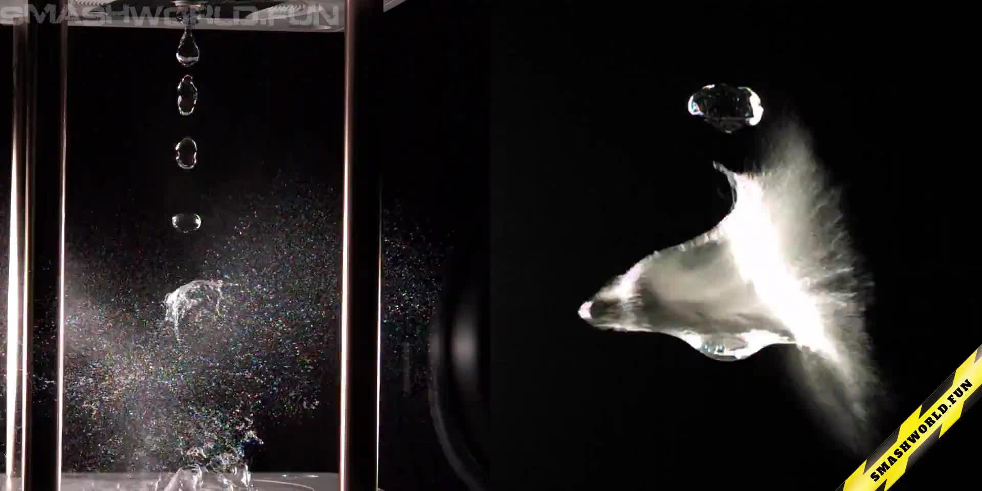 Mesmerizing slow-motion capture of a single water drop falling onto a guitar string. The drop elegantly splits and reacts to the string's tension, creating a delicate and visually captivating display of fluid dynamics.